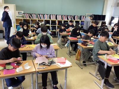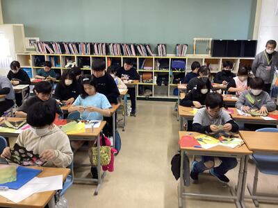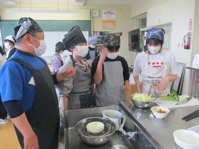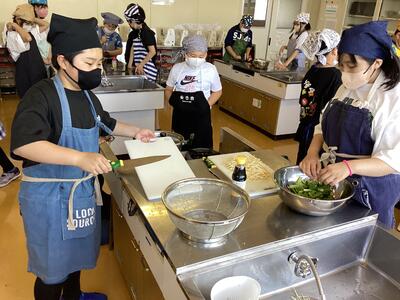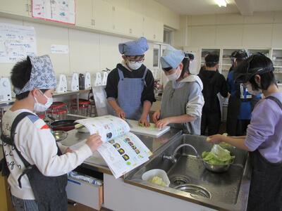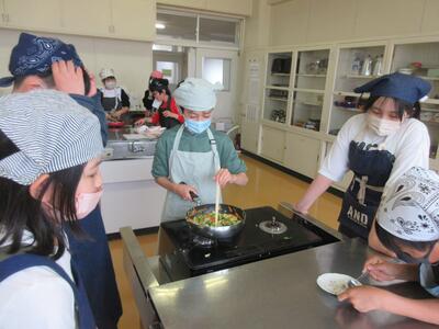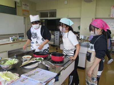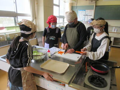 家庭科で三色野菜炒めを作りました。野菜を切ったり炒めたりするなど班で協力しながら上手に調理を行いました。