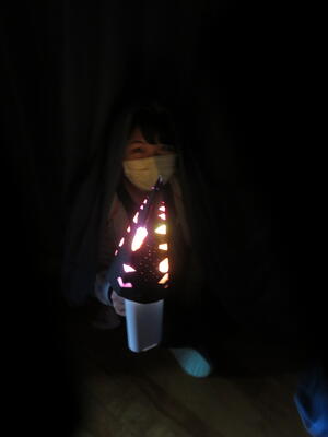 図工でランプシェードを作りました。黒い画用紙をお花紙で簡単に作ることができます。最後はみんなでライトアップしました。
