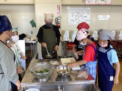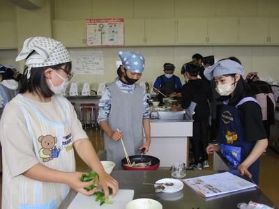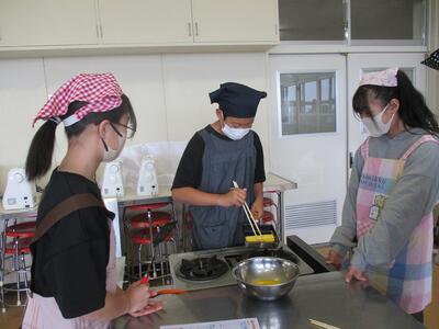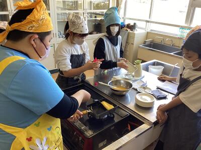 家庭科で2回目の調理実習を行いました。野菜をゆでたサラダや厚焼き玉子を作ったりしました。