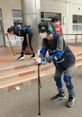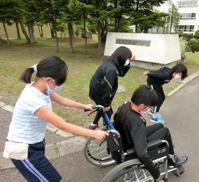 また、車いす体験も行い、介助者が階段を慎重に降ろしても「おっかない!」と叫ぶなど、車いすに乗っている人の気持ちを実感していました。
