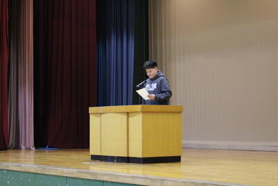 修了式では学級の代表児童が1名ずつ登壇し、「あゆみ」を受け取りました。名前が呼ばれると大きな声で返事をし、来年度の抱負を語りました。