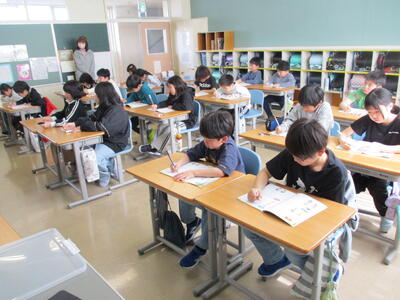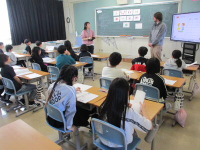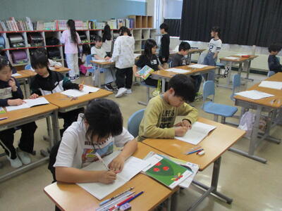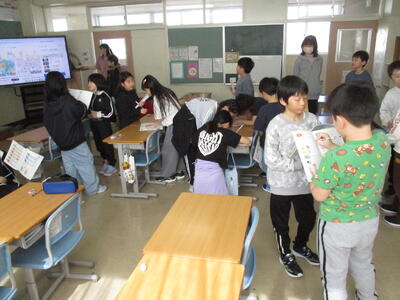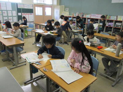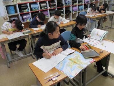 4月14日(火)4年1組・4年2組 投稿: 管理者 (15:53) ○4年1組 社会の授業のようす 地図帳と副読本を使って、北海道についてまとめていました。 一人で調べる、ペアで考える、数人で相談するなど、それぞれの方法で。 ○4年2組 外国語活動の授業のようす 挨拶と自己紹介 「I like ○○.」の学習。 いろんな友達と挨拶をして、相手の好きなものをメモします。
